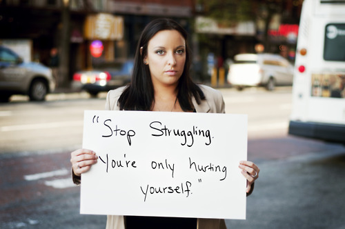 Secrets erupt on page after page from people who are pictured on Project Unbreakable, long-held secrets in the words on the posters they’re holding. Words that fathers and step-fathers and grandfathers and mothers and brothers and boyfriends  and dates and acquaintances said while abusing or raping them. “Now…Tell me you love me,” says one poster. “It is not going to hurt if you just relax,” says another.