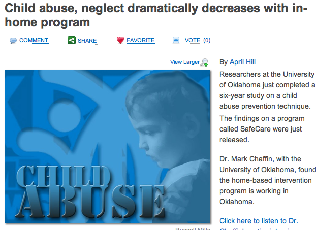 A six-year $3.4 million test of the SafeCare model of treatment for the prevention of child abuse and neglect involving 2,175 parents reduced the number of children going back into Oklahoma’s child welfare system from 70 to 50 percent, according to this post by April Hill on KRMG.com. Dr. Mark Chaffin, psychologist and professor of pediatrics at Oklahoma University’s College of Medicine, said that all home-based programs in Oklahoma have switched to the SafeCare model. According to the National SafeCare Training and Research Center site, the program is aimed at families with children under 5 years of age. The study is published in the March issue of Pediatrics, and is available at no charge online.