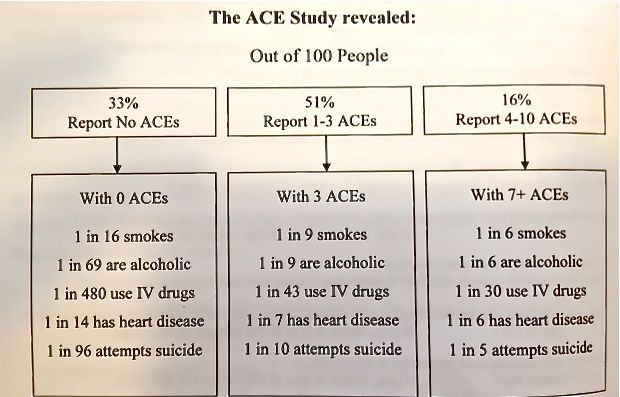 The study showed that the higher the ACE score, the higher the risk of disease, suicide, violent behavior, or being a victim of violence. People with an ACE score of 4 or more had significantly higher rates of heart disease and diabetes than those with ACE scores of zero. The likelihood of chronic pulmonary lung disease increased 390 percent; hepatitis, 240 percent; depression 460 percent; suicide, 1,220 percent. The percentages climbed to grim and astounding levels as the ACE score increased – people with an ACE score of 6, for example, had a 4,600 percent increase in the likelihood of becoming an IV drug user. And people with high ACE scores die, on average, 20 years earlier than those with low ACE scores.