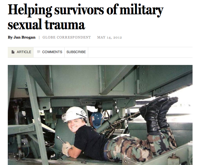 The U.S. Department of Veterans Affairs calls MST — military sexual trauma — an epidemic. It affects women disproportionately — one out of five, compared with one out of 100 men. It can lead to post-traumatic stress disorder, anxiety, depression, substance abuse, eating disorders, and hypertension, according to a very well-reported article by Jan Brogan on BostonGlobe.com. Experiencing sexual abuse in the military, and then figuring out what to do about it is difficult.
