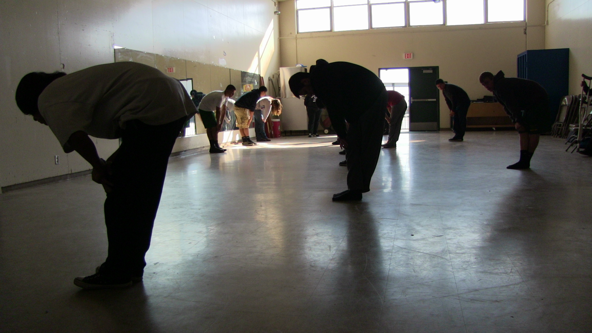 Students go through stretching exercises prior to working out in a martial arts class at Le Grand High School in Le Grand, CA.