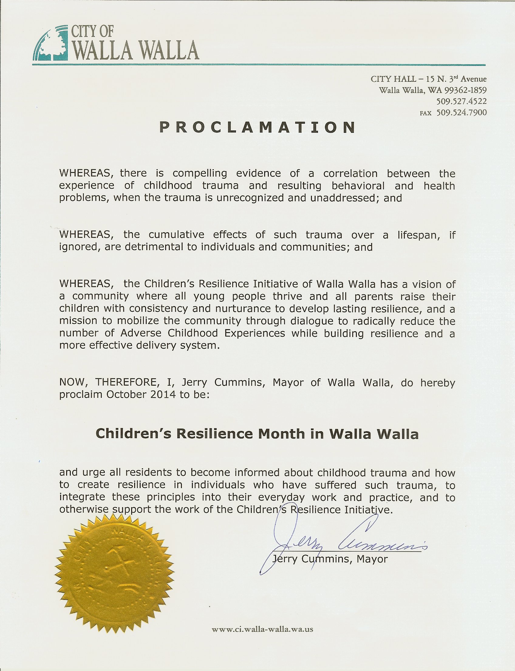 make Walla Walla a trauma-informed community. That led to a declaration that October 2013 was Children’s Resilience Month in Walla Walla. At a community festival that month, with speakers, music and food, families played 10 resilience games developed by Lincoln High School students taking a course in ACEs, brain development and resilience. It is being repeated this October.